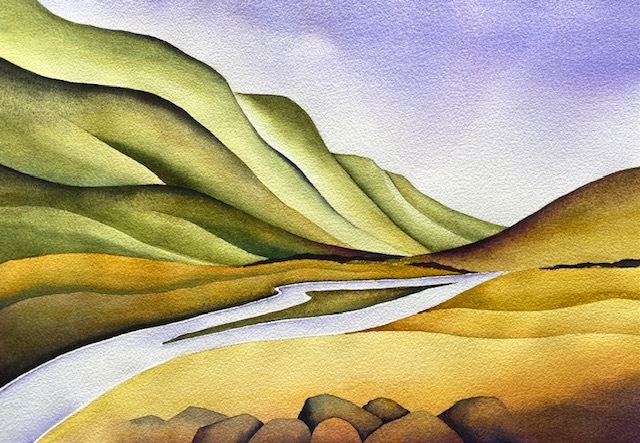 Watercolour landscape inspired by the South Island landscape in warm earthy tones. Original available and prints.