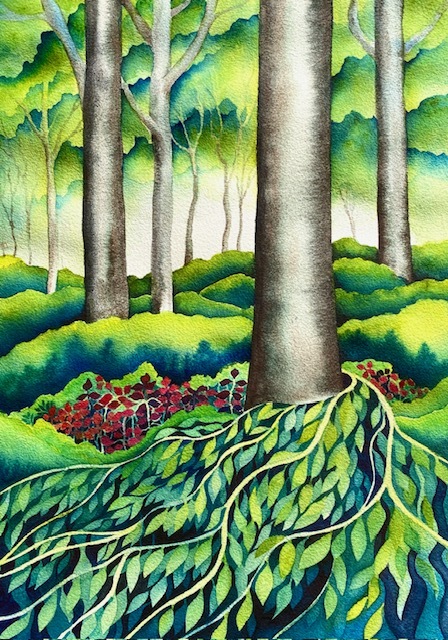 Watercolour painting inspired by walks in the forest using negative painting techniques. Original available and also as a print.