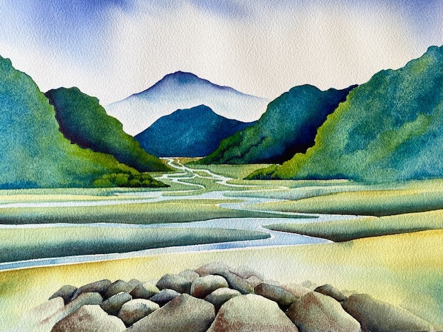 Watercolour landscape painting inspired by the braided rivers in the South Island of New Zealand. The original has sold but is available as a print.