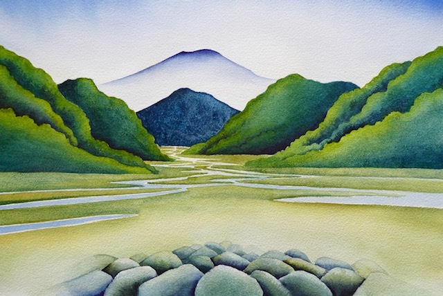 Watercolour landscape inspired by visits to the South Island of New Zealand. Original available and also as a print.
