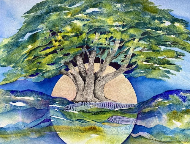 Watercolour painting with golden moon. 51 x 36 cm $500 unframed.