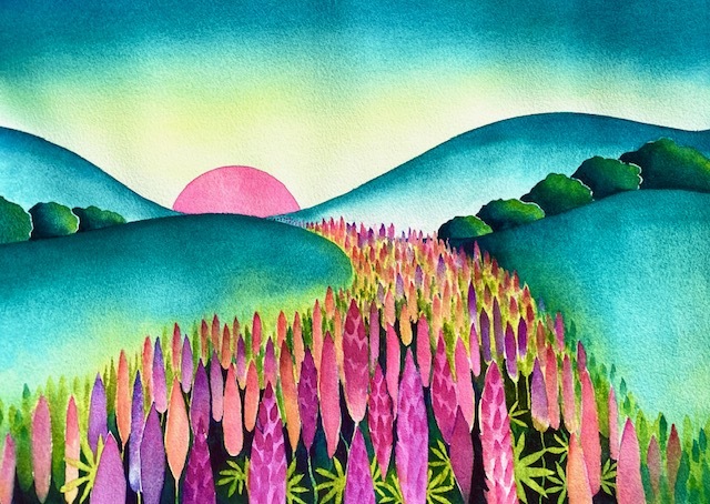 Watercolour landscape inspired by wild lupins - a splash of colour for your day.