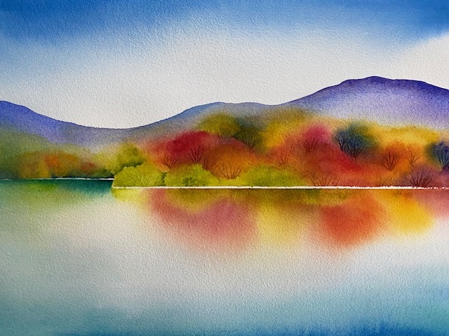 Glorious autumn colour captured in watercolour. Inspired by Lake Tūtira in Hawke’s Bay, New Zealand.$1000