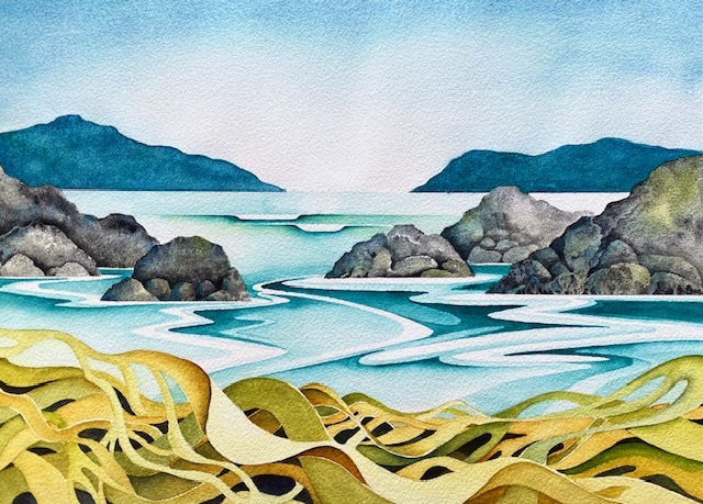 Watercolour painting of kelp and rocky coastline.