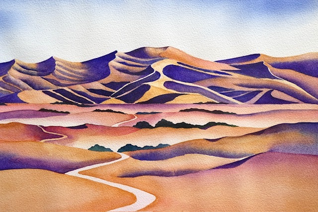 Watercolour landscape painting inspired by Central Otago in New Zealand’s South Island. 51 x 36 cm $950. Also available as a print $150