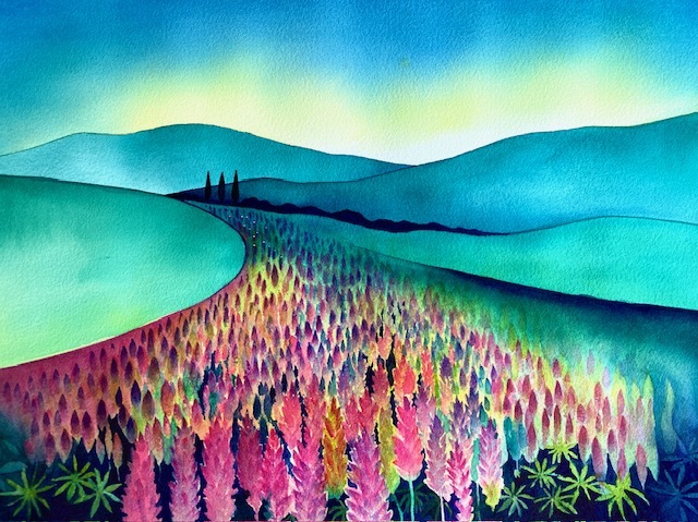 Watercolour landscape inspired by the wild lupins that grow near Lake Tekapo. Contact me for details. Original painting has sold but available as a print $150
